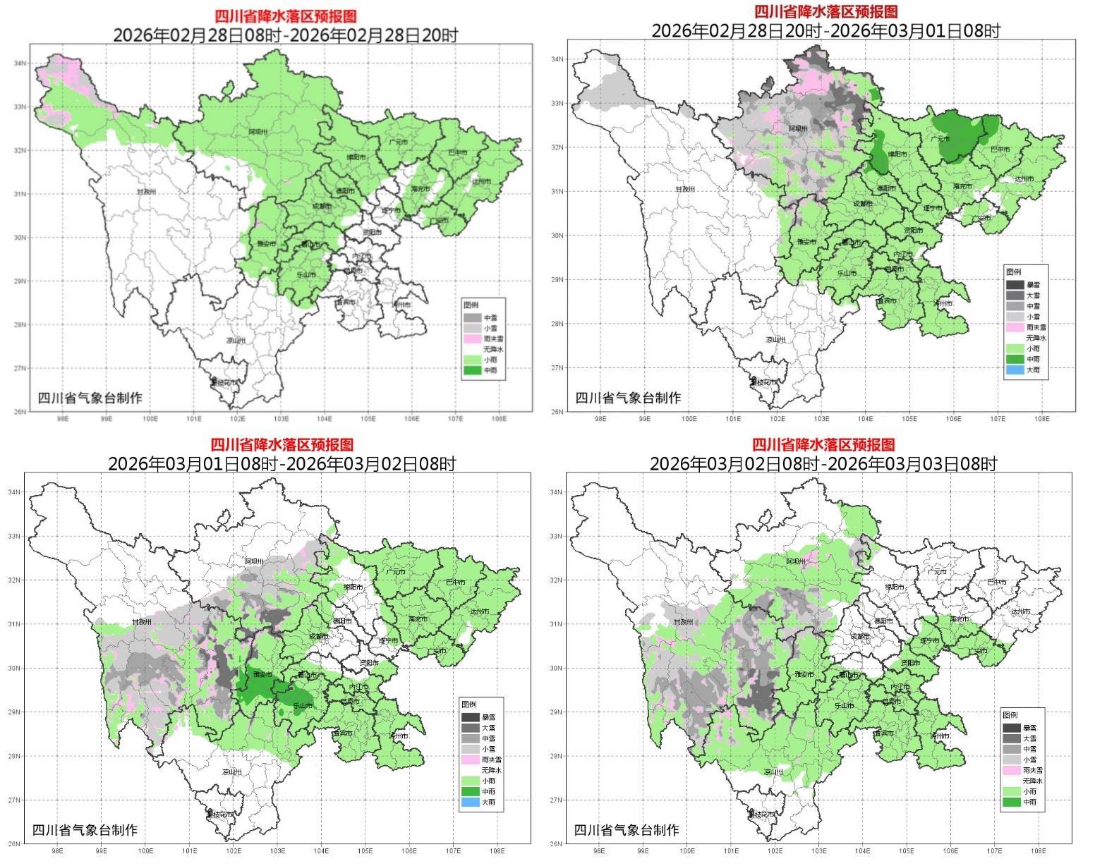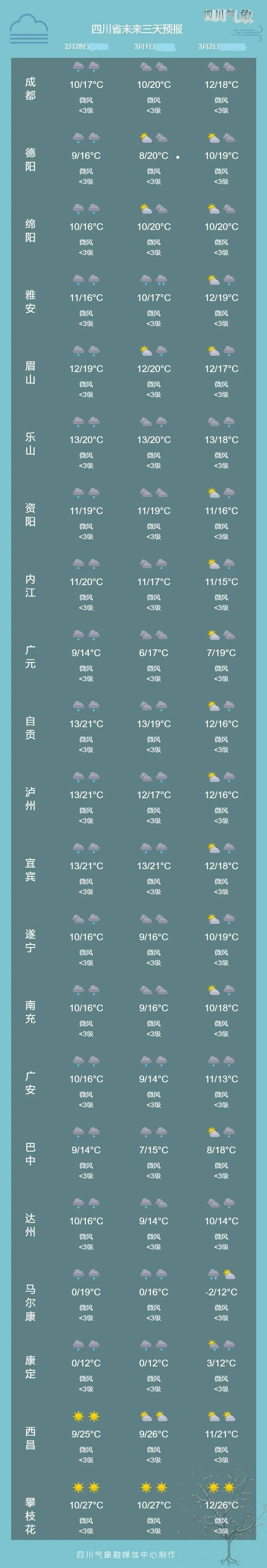 r3月1日白天到晚上,盆地各市阴天间多云,大部地方有小雨,西南部局部有中雨;阿坝州东部南部、甘孜州中部南部和凉山州北部阴天间多云有阵雪或阵雨,局地中到大雪,川西高原和攀西地区的其余地方多云间晴。